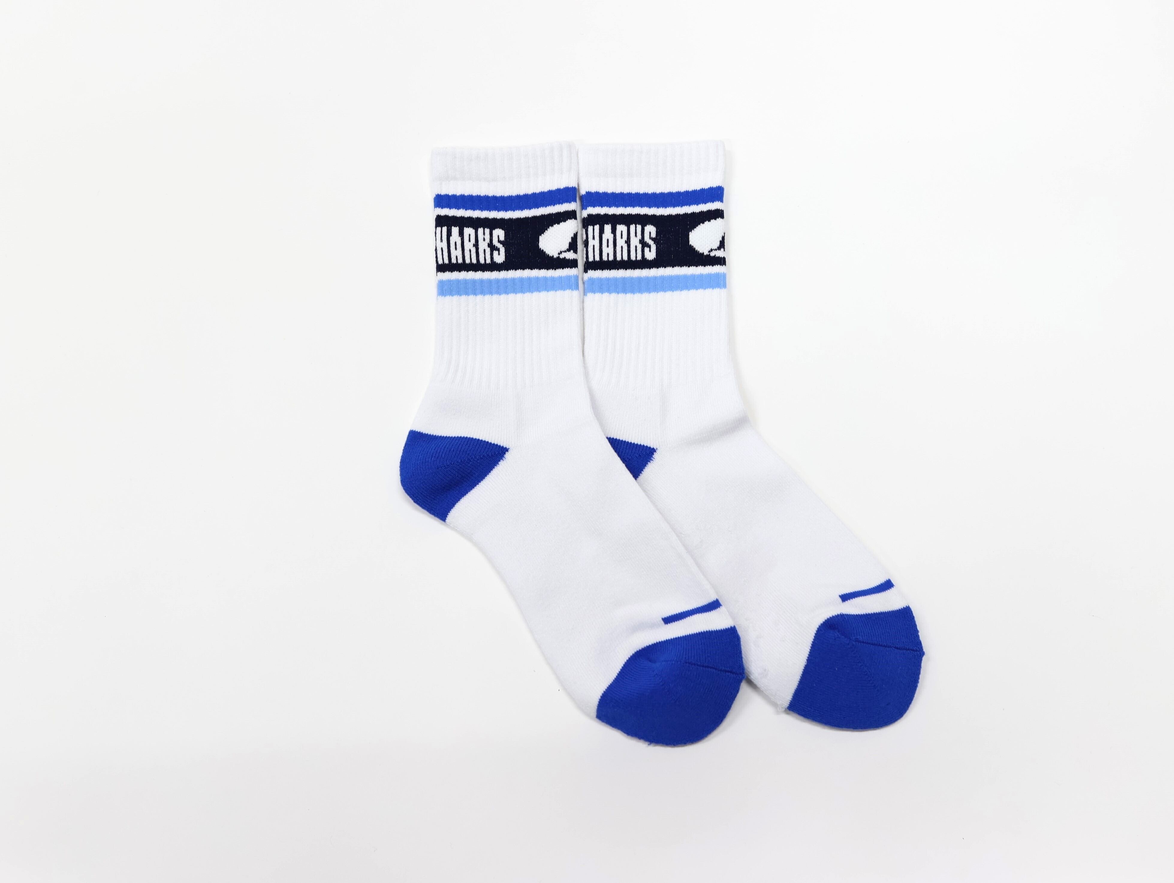 2023-24新商品ソックスが登場! 冬の凍てつく寒い日でも足下からあなたを暖める。 伸縮性に富んでおり、運動にも最適なので選手やコーチも愛用者続出中!? オールシーズンで使用できるデザインとなっておりますのでブルーシャークスファンのマストアイテムです!